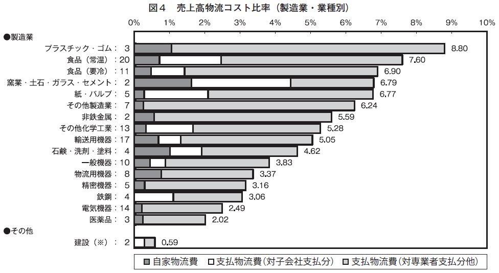 製造業では、「プラスチック・ゴム」の売上高物流コスト比率が最も高く、8.80%であった。一方、「医薬品」の売上高物流コスト比率が最も低く、2.02%であった。売上高物流コスト比率は、商品単価の影響を強く受ける。特に、素材・資本財などは価格が変動しやすいため、たとえば資源高によって単価が上昇すると、物流コスト比率が減少する。