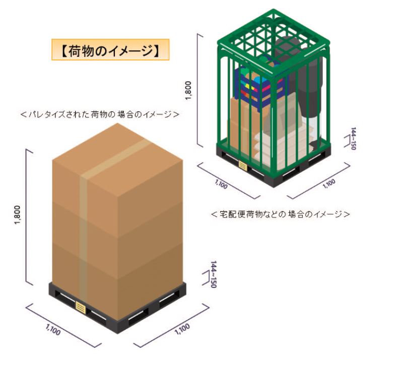 物流の小口・多頻度化の進行、積載効率、他モードとの役割分担の観点も踏まえ、自動物流道路の対象とする荷物は、小口の荷物をターゲットとし、パレット等に積載したサイズを輸送単位とすることが適当である。その規格については、拠点での積替えの自動化・機械化によるスムーズな実施を考慮すると、統一した規格の採用が必要であり、具体的には、官民物流標準化懇談会パレット標準化推進分科会において標準的な規格として推奨されている11型パレット(平面サイズ:1,100mm ×1,100mm)の規格を平面サイズの土台とした上で、土台も含めた輸送対象物の高さを1,800mm までの大きさとして設定し、物流需要や使いやすさ、輸送時の安定性を含めたインフラ設計、搬送技術開発などを議論・検証していくべきであるとされた。