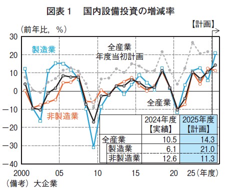 2024年度の大企業国内設備投資は、計画時点(前年比21.6%増)からは下方修正されたものの、通信・情報のAI 計算基盤構築や自動車の電動化投資などにより、3年連続で増加した(10.5%増)。非製造業はバブル期を超える高い伸びとなった(12.6 % 増)。また、 製造業も前年の高い伸び(12.8%増)からは鈍化したものの、4年連続で増加した(6.1%増)。