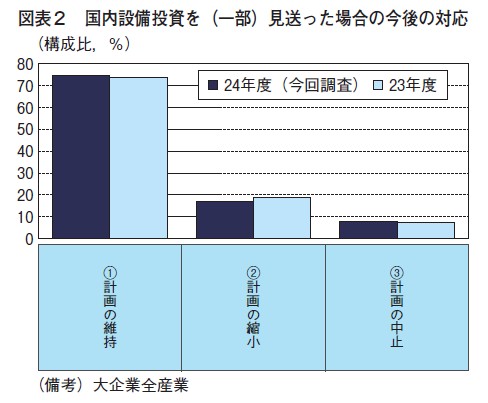 企業が投資を一部見送った場合の対応策について、米国の関税強化など先行き不透明感が広がる中でも、前年に続き7割以上の企業が計画を維持すると回答しており、今後の設備投資実現が期待される。