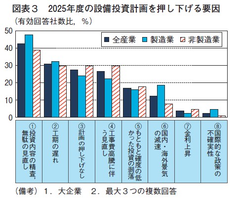 また、2025年度の投資計画を押し下げる要因として、米国の関税強化などによる「国際的な政策の不確実性」の割合は製造業が非製造業よりもやや高いものの、5% 未満と僅少であり、調査時点の6月の段階では、多くの企業が2025年度の設備投資計画に米国の関税強化による影響を十分に織り込んでいなかったものと考えられる。