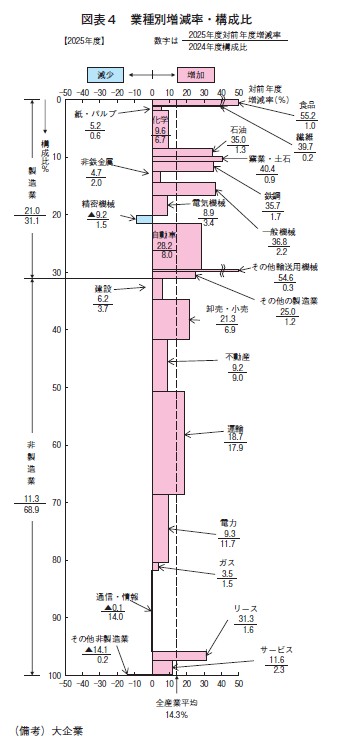 図表4は2025年度の設備投資計画の業種別動向をグラフ化したものである。横軸に各業種の増減率を、縦軸に業種別の構成比をとっており、各業種の面積が全体の増減率に対する寄与度を表す。