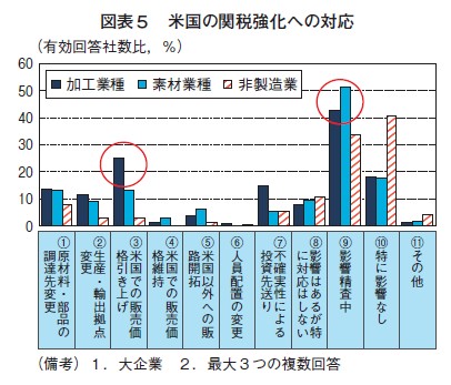 米国の関税強化に対して、多くの企業が「影響精査中」 と回答した。一方で、米国への輸出比率が高い加工業種では、競争力の高い一般機械を中心に「米国での販売価格引き上げ」の割合が高い。また、加工業種の一部に「不確実性による投資先送り」の動きがみられるが、全体的にサプライチェーン変更などの動きは限定的であり、米国の関税強化の影響はまだ顕在化していない。