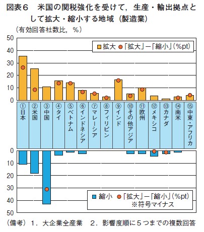 米国の関税強化を受けて、縮小する生産・輸出拠点としては、中国の割合が他地域を大きく引き離して最も高かった。一方で、拡大する地域としては、日本のほか、米国、東南アジア、インドなどの割合が高かった。なお、米国拠点については拡大だけでなく、縮小すると回答した企業も一定数みられた。