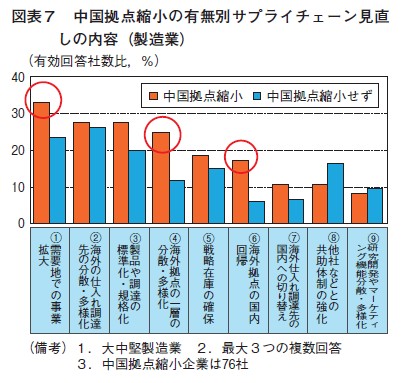 また、中国拠点を縮小する企業においては、「海外拠点の国内回帰」や「海外仕入れ調達先の国内への切り替え」と回答した割合が、それ以外の企業に比べて高い。加えて、「需要地での事業拡大」や「海外拠点の一層の分散・多様化」の割合も高く、日本を含む全世界でサプライチェーンの多様化を企図する動きがみられた。