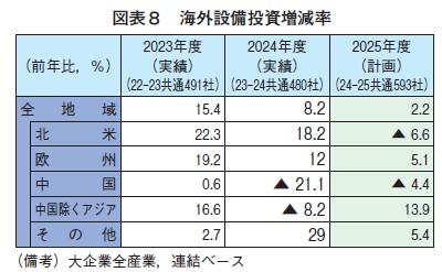 2024年度の海外設備投資(連結ベース、以下同)は前年比8.2%増となり、前年の15.4%増から伸びが鈍化した。地域別では、中国、中国除くアジアが減少したものの、北米が幅広い業種で増加し二桁増となったほか、欧州やその他地域も大きく増加した。