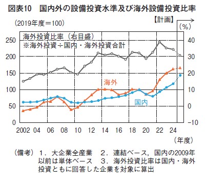 2025年度は、国内設備投資が二桁増を維持した一方で、海外設備投資の伸びは大きく鈍化し一桁台にとどまった。その結果、海外設備投資比率の低下が続く見込みである。