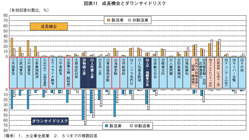 事業上の成長機会とダウンサイドリスクについて、成長機会よりもダウンサイドリスクの方を選択する企業の数が多い傾向は前年から変わらなかった。ダウンサイドリスクとして、米国の関税政策も含む「米中対立(関税等)」の割合は、「米国景気」、「中国景気」を下回った。これは、関税政策そのものよりも、それが国内外の実体経済に悪影響を及ぼすことを恐れている企業が多いことを示唆している。一方で、これら以上に、「物価上昇」、「人件費上昇」、「人手・後継者不足」の割合が高くなっており、より多くの企業が、国内の構造的な諸問題を最大のリスクとして認識していることを示している。