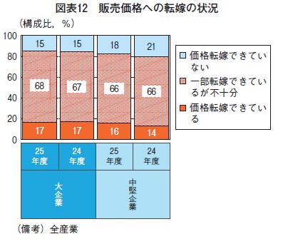先行き不透明感がある中でも、大企業の価格転嫁に大きな変化はみられない。中堅企業は、「転嫁できている」とする割合が小幅に上昇し、大企業との差が縮小している。ただし、両者とも「一部転嫁できているが不十分」の割合が7割近く、今後とも継続的な価格転嫁が必要となる。