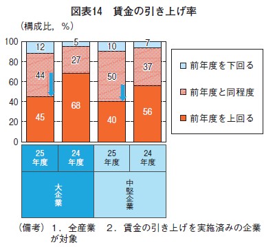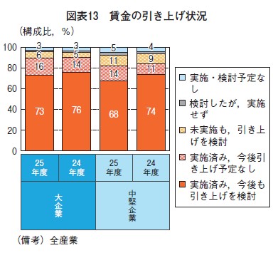 賃金の引き上げ状況は、「今後も引き上げを検討」の割合が小幅に低下も、大・中堅企業ともに約7割を維持し、賃上げスタンスに大きな変化はない。一方、賃金の引き上げ率は、大・中堅企業とも「前年度を上回る」と回答した割合が低下し、前年と比べれば賃金引き上げペースが鈍化した。ただし、大・中堅企業ともに「前年度を上回る」と回答した企業が4割以上おり、「前年度を下回る」の割合を大きく上回っている。また、中堅企業の前年度からの低下幅が比較的小さく、大企業との差が縮小している。