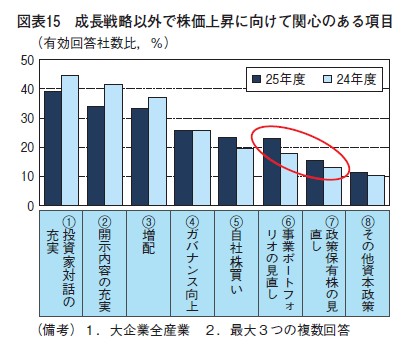 株価上昇に向けて関心のある項目については、「投資家対話の充実」および「開示内容の充実」の割合が低下する一方で、「自社株買い」や「事業ポートフォリオの見直し」、「政策保有株の見直し」など、より事業に関わる取り組みの割合が上昇している。