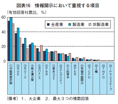 情報開示において重視する項目については、過半の企業が「中期経営計画」を挙げたほか、製造業では「ROE」、「ROIC」などの財務指標への注目が高く、非製造業では相対的に「ガバナンス」も重視されている。