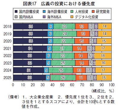 有形固定資産以外も含む広義の投資において、2025年度は、足元低下傾向にあった国内設備投資の割合が上昇した。また、人材投資の優先度がここ数年徐々に高まってきている。