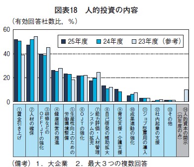 人的投資の内容としては、「賃金引き上げ」の割合が「人材の確保」を上回り、賃上げを人的投資と捉える動きが加速した。また、ウェルビーイングの浸透などもあり、「健康経営の推進」や「生産性向上のための労働環境整備」の割合も前年より高まった。一方で、「成果連動の強化」や「社内起業支援」、「ジョブ型雇用の導入」など日本の雇用慣習を根本から変える施策の割合は引き続き僅少にとどまった。