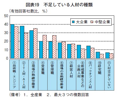 大企業、中堅企業ともに、幅広い種類の人材が不足しており、特に大企業では「IT 人材・AI 人材」が不足しているとする企業の割合が高く、中堅企業では「現場の熟練労働者」、「営業職」、「管理職」が不足しているとする企業の割合が高い。