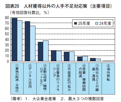 人材を獲得できなかった場合の対策としては、「業務の削減・合理化」のほか、「デジタル活用」の割合が高まった。また、製造業を中心に「自動化投資」の割合も高く、人手不足に対応するための省人化投資のニーズは引き続き旺盛と考えられる。一方で、「従業員のリスキリング」などの取り組みはさほど高まらなかった。