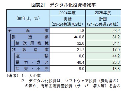 2025年度は、全産業で前年比23.2%増の計画。製造業では、工場効率化や輸送用機械におけるSDV(Software Defined Vehicle:ソフトウェアによって定義される車)対応の投資等がけん引し、31.2% 増加する計画。非製造業では、電力・ガスに加え、運輸や小売における業務効率化投資などにより17.9% 増の計画となっている。