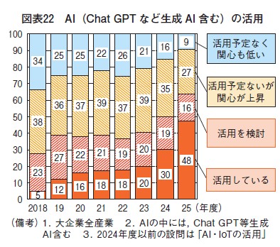 AI について、「活用している」とした割合は、生成AI の普及を背景に前年度から一層高まり、半数近くを占める結果となった。