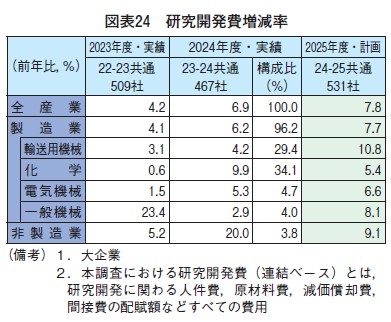 2024年度の研究開発実績は、輸送用機械ではカーボンニュートラル(CN)関連開発、化学では医薬品、半導体材料をはじめとする高機能品開発が進められたことから、前年比6.9%増となり、2023年度の同4.2%増を上回る伸びとなった。