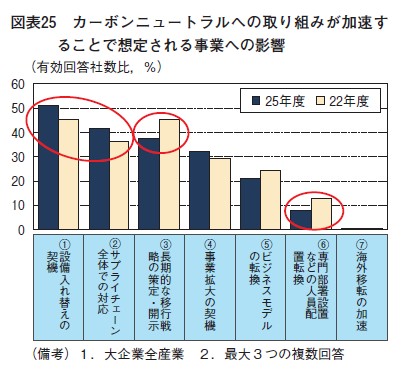 カーボンニュートラルの事業への影響について、2022年度との比較では、「長期的な移行戦略の策定・開示」や「人員配置転換」など、企業内での初期的な取組み段階での整備が求められる項目の割合が低下する一方、「設備入れ替えの契機」や「サプライチェーン全体での対応」の割合が上昇し、取り組みが徐々に具体化している。