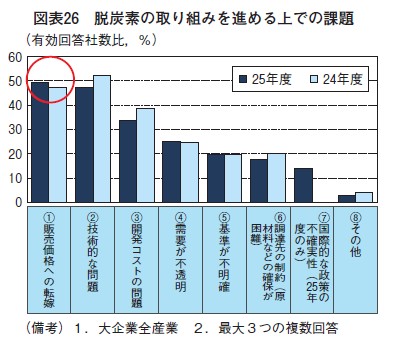 脱炭素の取り組みを進める上での課題については、「販売価格への転嫁」が「技術的な問題」を上回った。取り組みが具体化する中で、経済性にも目を向ける企業が増え、脱炭素の取り組みを続ける上で生じるコスト増を、いかに販売価格に転嫁するかが重大な課題となっている。