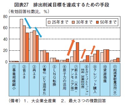 排出削減を達成するための手段としては、2025年の段階では「省エネ」と「再エネ」が過半を占めているが、2030、2050年と時代が進むにつれて、水素・アンモニア等の「新エネ」や炭素回収等の「ネガティブエミッション技術」のほか、「クレジット購入」などの割合が高まる。
