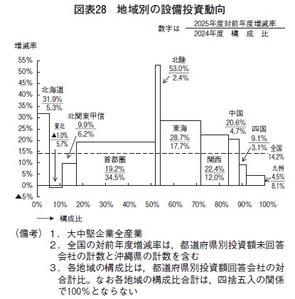 大企業・中堅企業の設備投資は、全国で14.2%増を見込む。10地域中9地域で増加する計画であり、北陸、北海道、東海の伸びが特に高い。