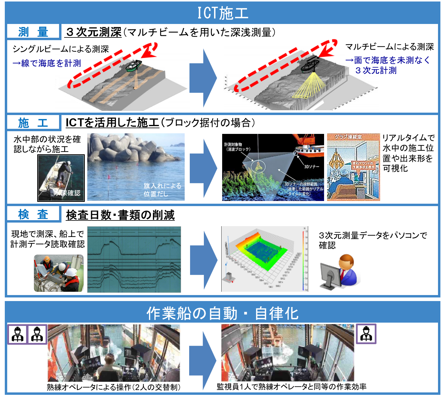 港湾分野では、i-Construction2.0、インフラDX推進に向けて、ICT施工の工種拡大による「生産性向上」、「BIM/CIMの活用」、「遠隔操作・自動・自律化施工」の3つのテーマを掲げている。