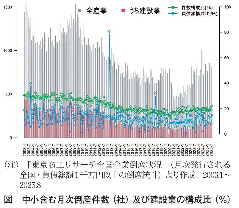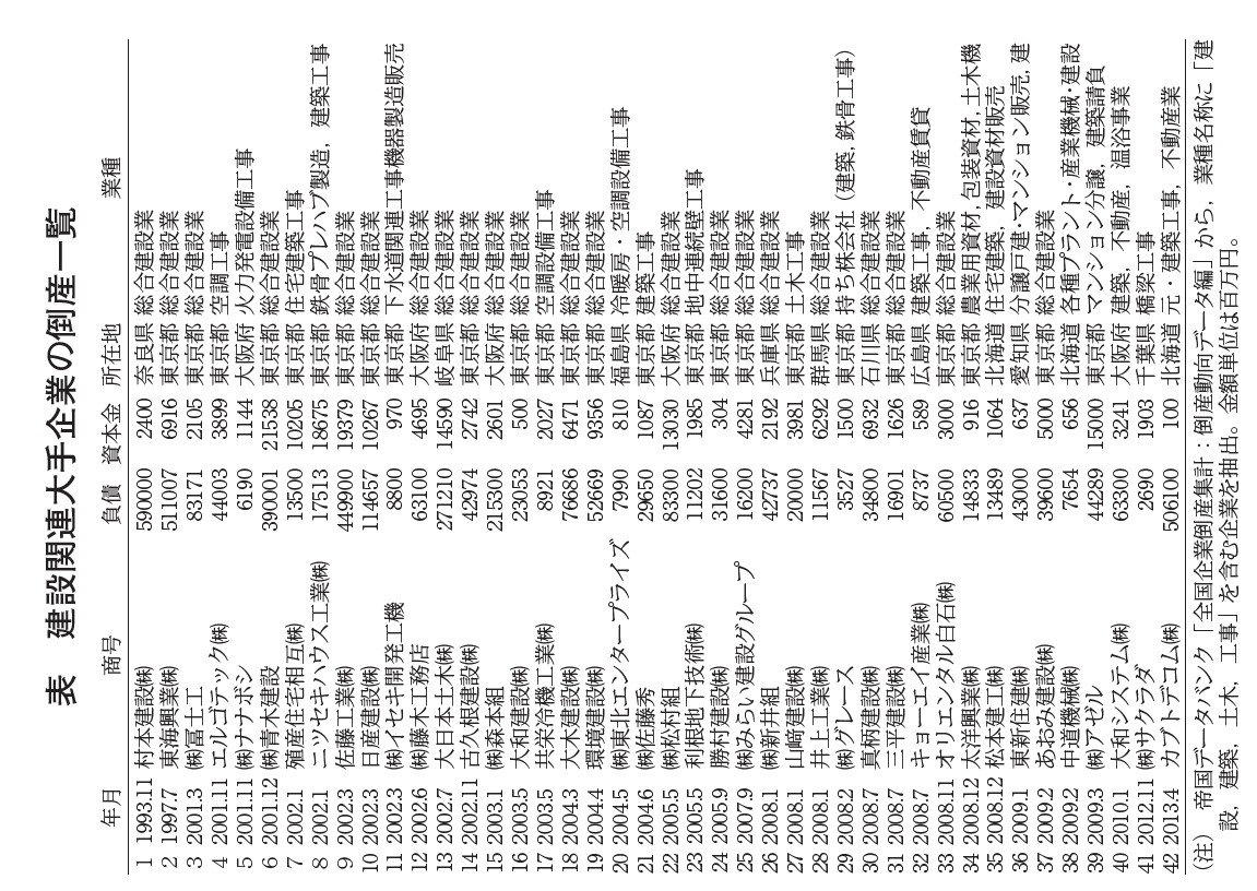 両社の報告から建設業の情報を拾った(表、図)。表は1993年の村本建設から始まる大手建設関連企業の倒産一覧である。大手倒産事例は民事再生法や特定調停法が施行された2000年からの約10年に集中する。以後は目立つものが少なく、一見穏やかな状況が続く。また、図は2003年以降の月次の全国倒産データのまとめである。倒産件数の棒グラフは、灰色が全産業を、赤色が内数の建設業を示す。また、緑色の折れ線は建設業の件数ベースの構成比を取った。青色のそれは負債額の構成比である。件数の構成比は20%前後を推移する。建設業の倒産数は主要産業別でみると、サービス業に次ぎ、卸・小売業計と同レベルで多い。