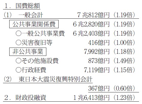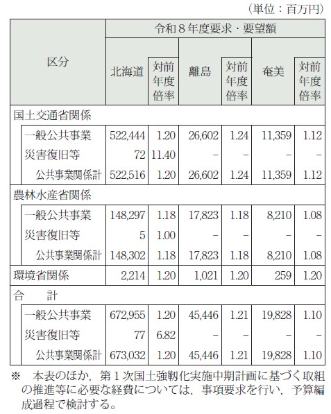 地域の総合開発等の推進を図るため、北海道、離島及び奄美群島に係る公共事業予算は、農林水産省及び環境省関係を含めて国土交通省に一括計上を行っている。