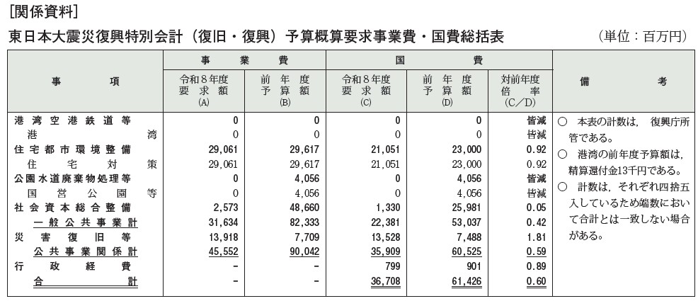 「第3期復興・創生期間」における東日本大震災の被災地の住まいの再建や復興まちづくりを着実に推進するとともに、インフラの整備や被災者の暮らしを支える被災地の地域公共交通、福島県の震災復興に資する観光関連事業等に対する支援を引き続き実施する。