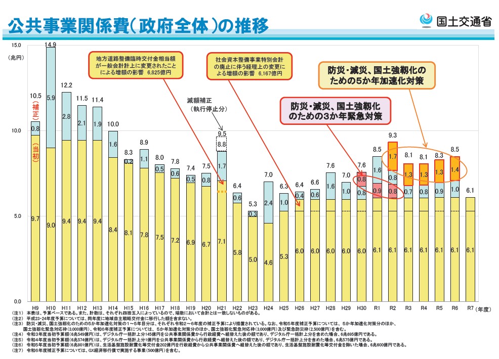 ○ 社会資本整備は未来への投資であり、ストック効果の最大化に取り組む必要がある。予防保全型メンテナンスへの本格転換等既存施設の計画的な維持管理・更新・利活用を図りながら、上記の3本柱の実現に資する波及効果の大きなプロジェクトを戦略的かつ計画的に展開することが不可欠であり、中長期的な見通しの下、必要かつ十分な公共事業予算の安定的・持続的な確保を図る。その際、労務費確保の必要性や近年の資材価格の高騰の影響等を考慮しながら適切な価格転嫁が進むよう促した上で、今後も必要な事業量を確保する。