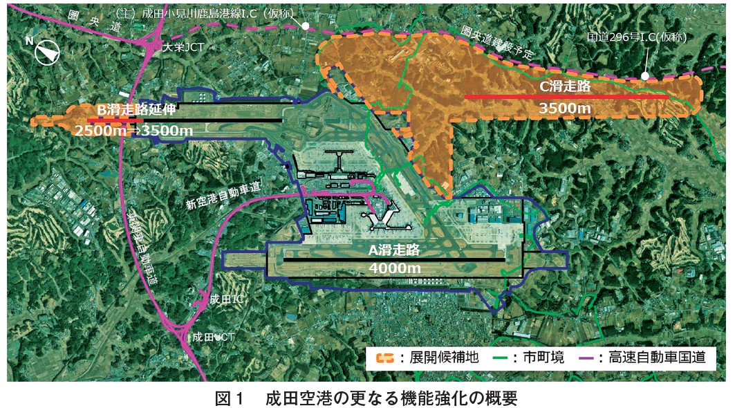 一方で、近隣のアジア諸国においては、国際航空需要を取り込むため、例えば仁川空港(韓国)では、昨年に旅客ターミナルの拡張や4本目の滑走路の供用が開始され、チャンギ空港(シンガポール)では、2030年までに3本目の滑走路の供用が予定されているなど、大規模な空港整備が進められている。経済成長著しいアジア発着の旺盛な航空需要を捉えることが、我が国の国際競争力強化のためには不可欠であることなどから、成田空港の年間発着容量50万回を実現するため、B滑走路の延伸(2,500m→3,500m化)とC滑走路の新設(3,500m×45m)等といった更なる機能強化について、平成30年(2018年)3月の地元合意に基づき、令和10年度(2028年度)末目処の供用開始を目指し、用地の確保や滑走路の整備を進めている(図1)。
