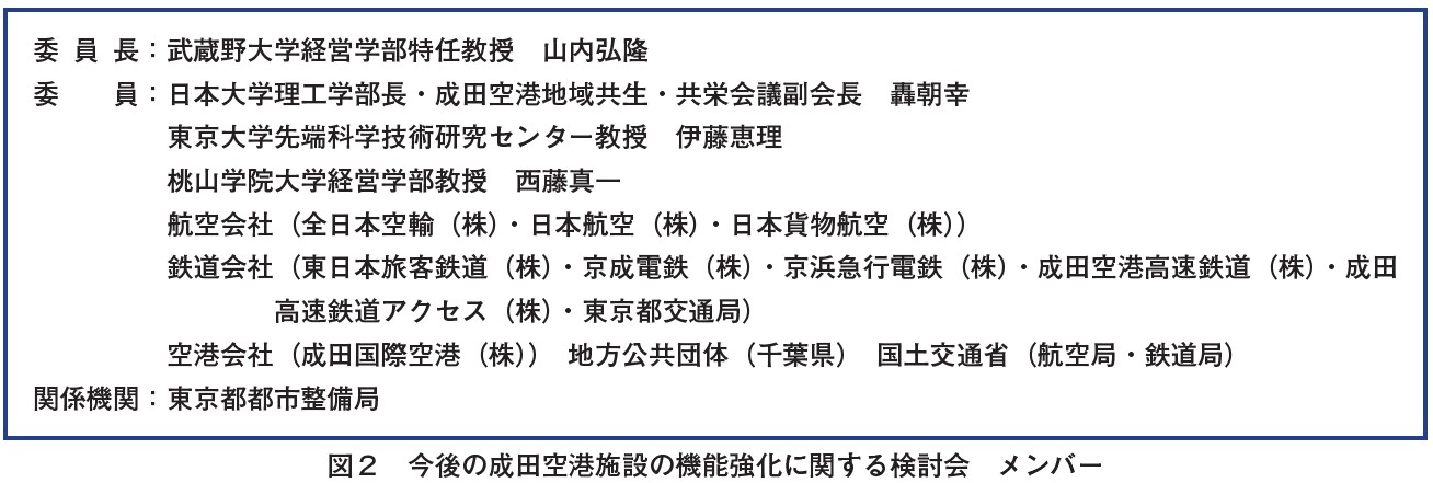 このような状況を踏まえ、成田空港の「更なる機能強化」により新滑走路の整備等とあわせて必要となる旅客取扱施設や貨物取扱施設等、都心・更には羽田空港との鉄道アクセスといった今後の成田空港の施設面での機能強化について、課題と対応について航空事業者や鉄道事業者を含めたステークホルダーによる議論を行うため、「今後の成田空港施設の機能強化に関する検討会」を令和6年(2024年)9月より開催し、今年6月に中間とりまとめを行ったところである(図2)。以降では、この中間とりまとめで示した現状及び課題と対応の方向性について述べていく。