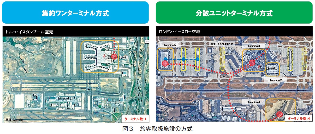 前述の課題に対応した旅客取扱施設の実現のため、分散ユニットターミナル方式と比較して、以下のような利点のある「集約ワンターミナル方式」に優位性があると考えられる。