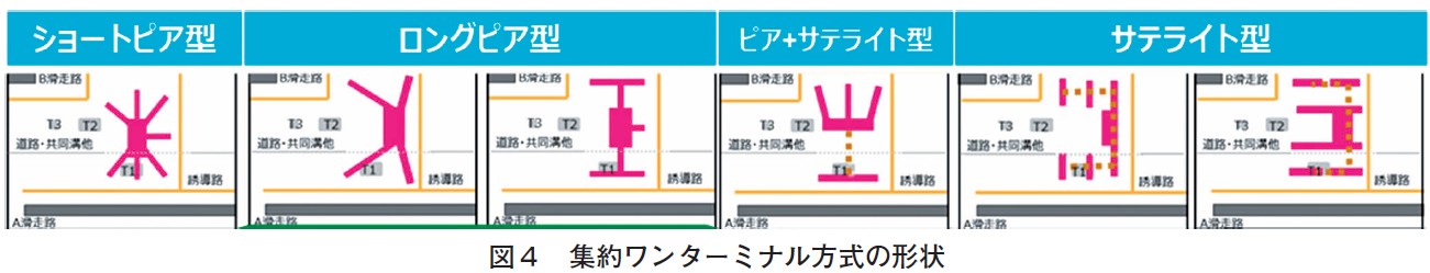 また、集約ワンターミナル方式の形状は、一般的に図4の4つのタイプに大別されるところ、旅客利便性、航空機や館内のオペレーション、建設コスト等の観点から、ロングピア型をベースとして、検討を深化させる必要がある。