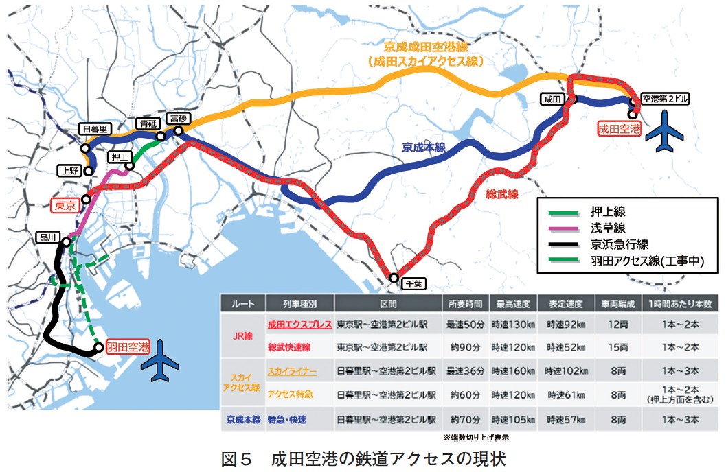 成田空港と都心を結ぶ鉄道アクセスルートには、主に、東日本旅客鉄道株式会社(以下「JR 東日本」という。)による成田線及び総武線を経由するルート(以下「JR 線」という。)、京成電鉄株式会社(以下「京成電鉄」という。)による成田スカイアクセス線及び京成本線の3ルートが乗り入れている(図5)。成田空港は都心部駅から50㎞以上離れた場所に立地しており、海外の同規模以上の空港における鉄道アクセスと比較すると都心部からの所要時間は長いものとなっている。