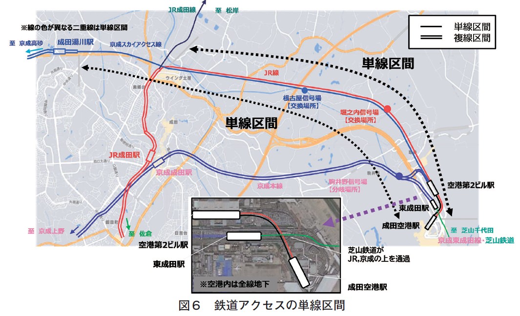 空港周辺においては、旧成田新幹線用施設をJR 線及び成田スカイアクセス線が1線ずつ使用しており、約9㎞にわたる単線区間が存在している。また空港駅においては、第1ターミナルに直結する成田空港駅と、第2ターミナルに直結するとともに第3ターミナルにも連絡できる空港第2ビル駅があるが、その間は空港周辺と同様に単線区間となっているなど、単線区間の存在により列車運用や輸送力に一定の制限が存在している(図6)。