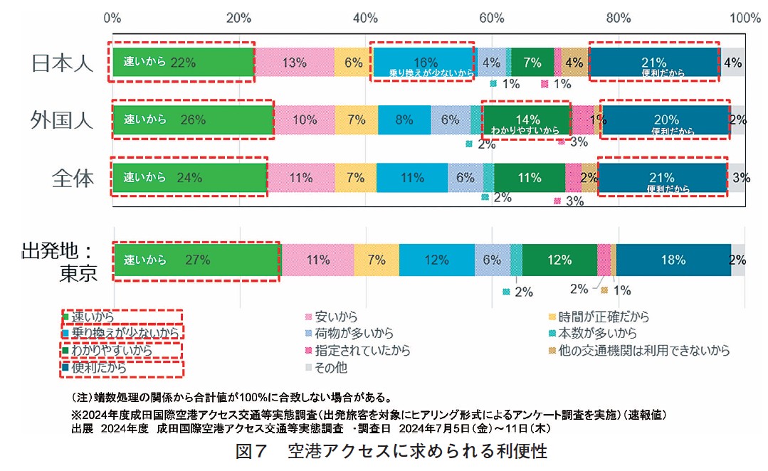 また、NAA が実施した調査によれば、航空旅客が鉄道アクセスに求める主な質的要素としては「速い」が最も多く、次いで「便利」、続く項目として、日本人では「乗り換えが少ない」、外国人では「わかりやすい」が挙げられており、これらの利便性を備えた鉄道アクセスとすることが求められる(図7)。