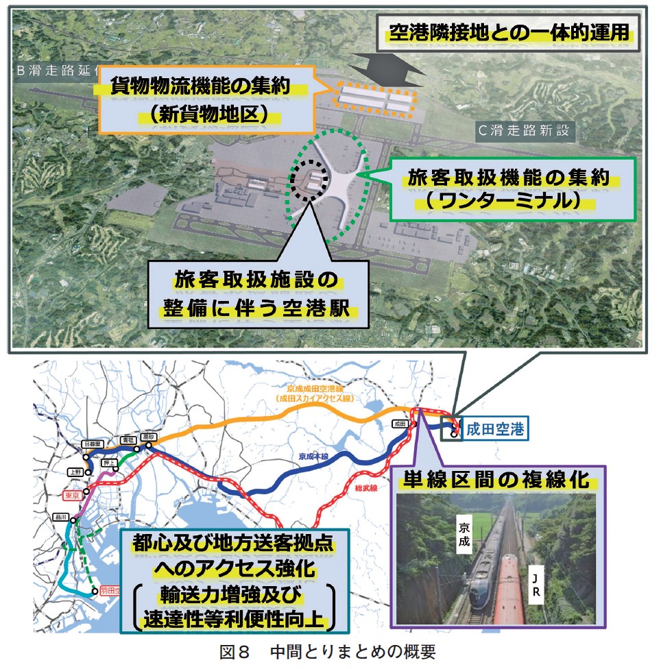 また、空港内および空港周辺の単線区間の複線化や空港駅の十分な容量の確保、空港内の折り返し機能も含めた輸送力の増強が求められる。加えて、成田空港の国際競争力を確保するためには、利用者目線に立ち、旅客の移動を極力少ないものとし、円滑・迅速かつ快適に利用できるよう、旅客ターミナルに直結した位置に駅が設置されていることが望ましいことから、前述の旅客取扱施設の整備と連動した対応が必要となる。