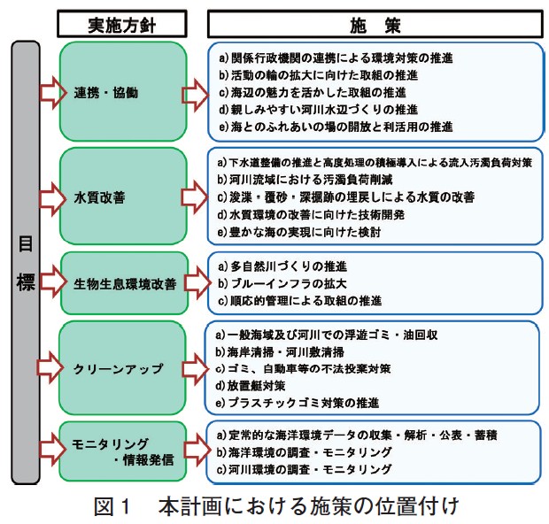 実施方針は、「連携・協働」、「水質改善」、「生物生息環境改善」、「クリーンアップ」、「モニタリング・情報発信」の5項目毎に定め、その方針に則って、各施策を進めていくこととした(図1)。