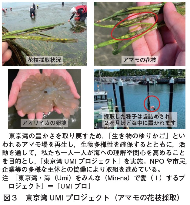 東京湾の水環境再生を効率的・効果的に進めるため、行政・市民・NPO・民間企業など様々な主体が目的や活動フィールドを共有し、モチベーションや知識を高めながら環境再生に向けて連携・協働で取り組めるよう、地域のニーズや環境への効果、継続性などを見極めたうえで、具体的な活動の仕組みづくりを行う(図3)。