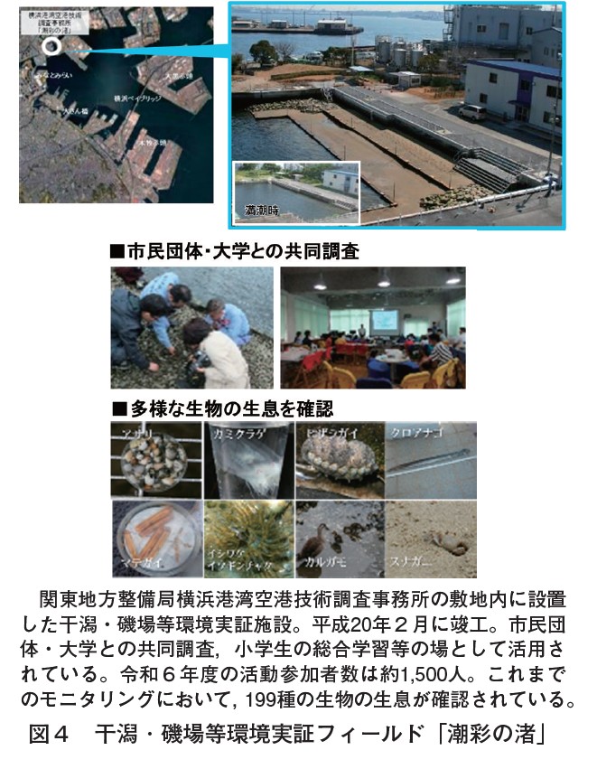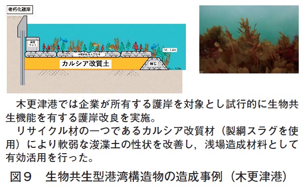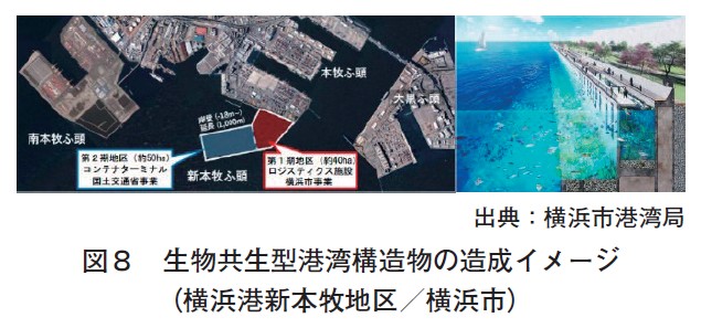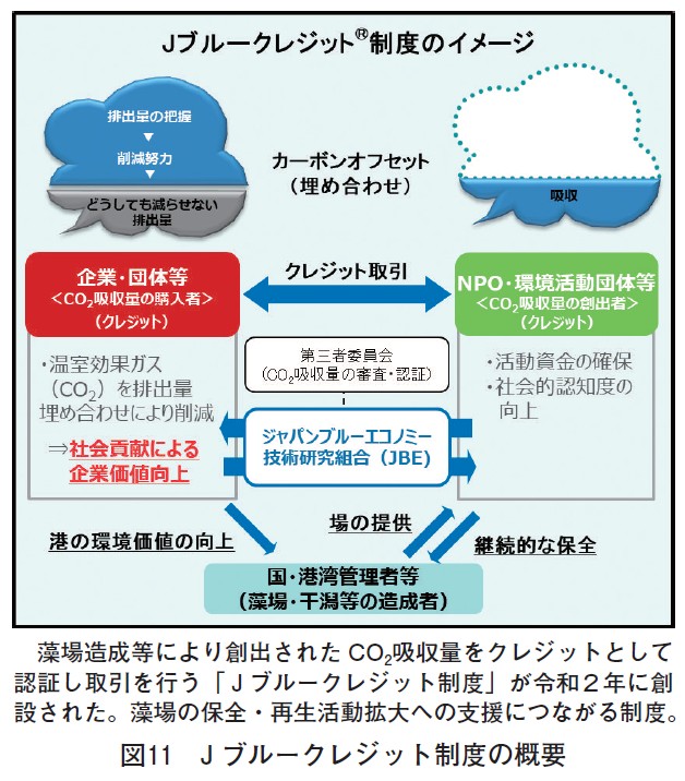 令和4年12月、国土交通省港湾局は、海洋植物が持つCO2吸収や水質浄化といった効果に着目し、藻場や干潟などの生態系を活用したCO2吸収源の拡大によるカーボンニュートラル実現への貢献や生物多様性の豊かな海の実現を目指し、藻場・干潟及び生物共生型港湾構造物を「ブルーインフラ」と呼び、これらの拡大を進めるため「命を育むみなとのブルーインフラ拡大プロジェクト」を推進することとした。