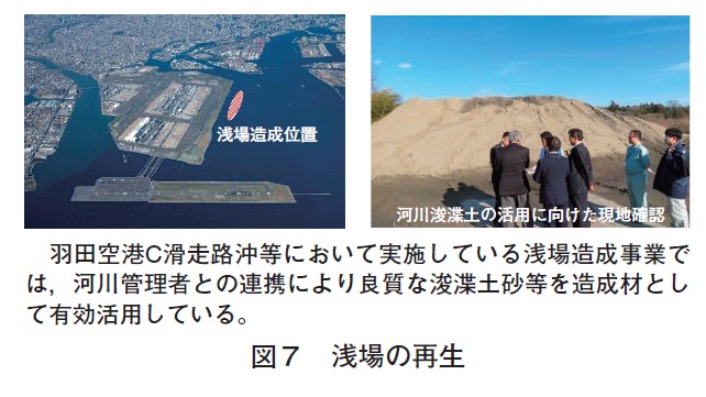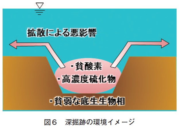 これまで港湾においては、東京湾奥部を中心に汚泥堆積が進む海域での汚泥浚渫や、底質からの栄養塩類等の溶出を抑制するための覆砂を実施してきた。また、東京湾内には過去に埋立地を造成するための大規模な土砂採取により、青潮の原因である貧酸素水塊の発生場所の一つとなっている深掘跡が点在していることから、港湾工事で発生した浚渫土を活用した深掘跡の埋戻しを実施している(図6)。