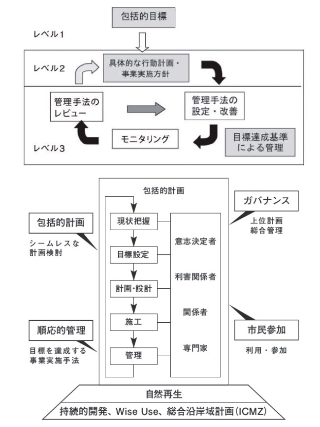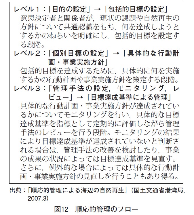自然再生の目的を達成するため、自然の不確実性により当初の計画では想定していなかった事態に陥ることを予め管理システムに組み込み、計画目標の達成状況をモニタリングしながら、柔軟に対応していく「順応的管理手法」が提唱されている(図12)。