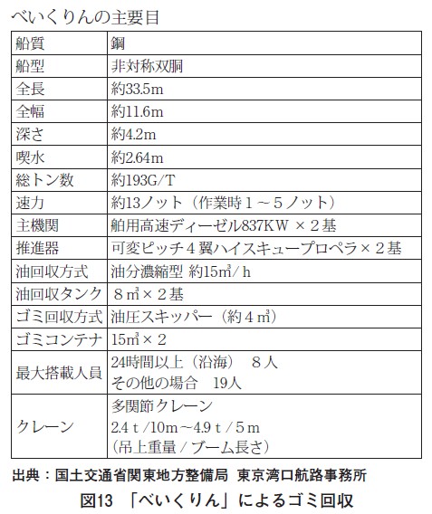 現在、東京湾内の各港湾区域では、港湾管理者が所有する清掃船、港湾区域を除く一般海域では、関東地方整備局が所有する清掃兼油回収船「べいくりん」により、浮遊ゴミ等の回収・処理を実施している。また、流入河川においては、関東地方整備局が所有する水面清掃船により、ゴミ等の回収・処理を実施している(図13)。