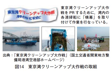 関東地方整備局では、湾内の港湾管理者及び第三管区海上保安本部と連携し、毎年7月の海の月間に東京湾における海面浮遊ゴミ及び油の回収業務の実態と重要性を市民の皆様に知って頂き、ゴミを海や川に捨てないよう意識啓発を図る「東京湾クリーンアップ大作戦」を実施している(図14)。
