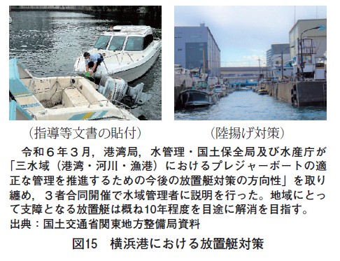 国土交通省及び水産庁では、平成8年度より、港湾・河川・漁港等の三水域を対象とし、「プレジャーボート全国実態調査」を実施している。平成25年5月には、「プレジャーボートの適正管理及び利用環境改善のための総合的対策に関する推進計画」を策定し、水域管理者をはじめとする関係者と連携し「係留・保管能力の向上」と「規制措置」を両輪とした放置艇対策を推進してきた(図15)。