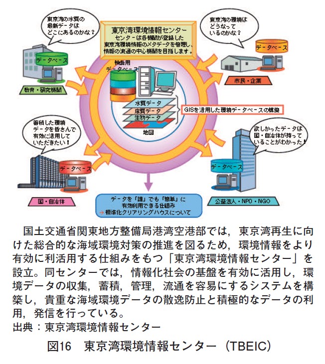 東京湾において、様々な主体が調査・収集を行っている環境データについて、包括的に収集・公表を行っていくため、関東地方整備局 横浜港湾空港技術調査事務所に設置した「東京湾環境情報センター(TBEIC)」の機能の充実を図り、東京湾全体の環境データを一元的に提供できるようシステムの強化を進める(図16)。