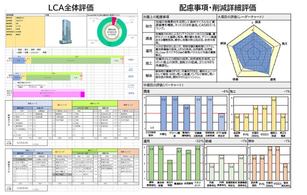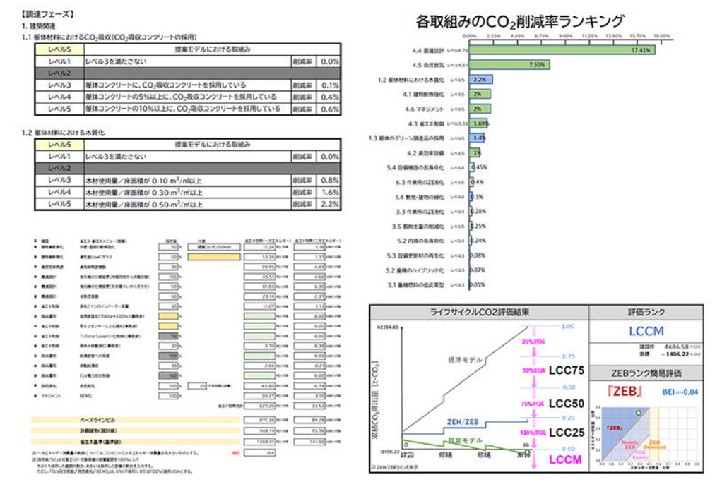 建物の調達・施工・運用・修繕・解体といったライフサイクル全体を対象に、CO₂排出量の概算値や削減効果を手軽に算出できるのが特徴です。これにより、施主が掲げる削減目標に沿った建設計画の立案を支援できるとしています。
